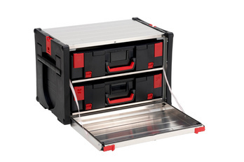 Problemloses Übereinanderstapeln und festes Verrasten der Boxen durch raffinierten Koppelmechanismus.