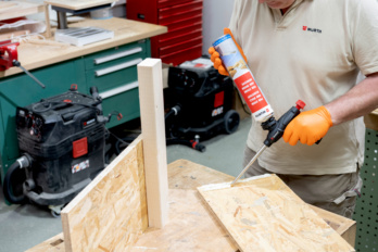 De hechtvlakken moeten schoon, stofvrij en duurzaam zijn, en beide verbindingsdelen moeten een vlak oppervlak hebben. Schud het blik vóór elk gebruik krachtig ten minste 20x. Verwijder het veiligheidsdeksel en schroef het blik ondersteboven op het pistool (art.nr. 0891152600). De toevoerhoeveelheid wordt geregeld door de trekker en de doseerschroef op het pistool te bedienen. De opkomende lijm vormt na een paar seconden een dunne, vullende kleeflaag. Zodra de lijm is neergeslagen, kan de hechting plaatsvinden. De optimale bustemperatuur is 20°C.